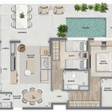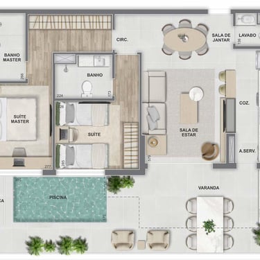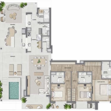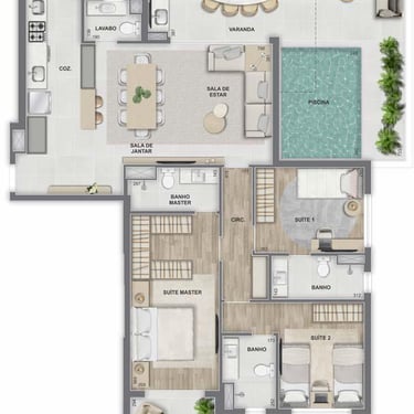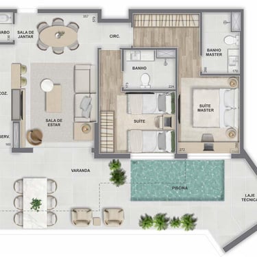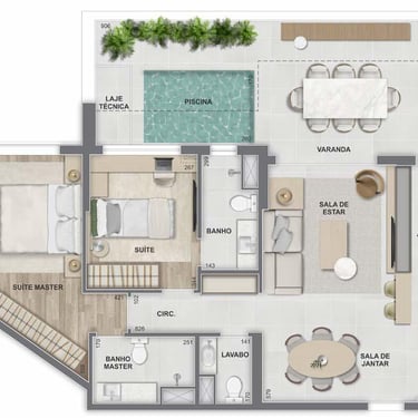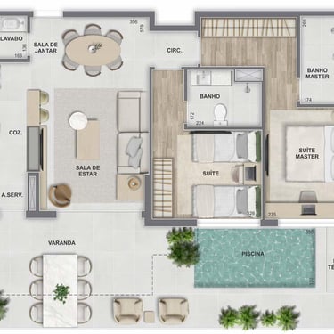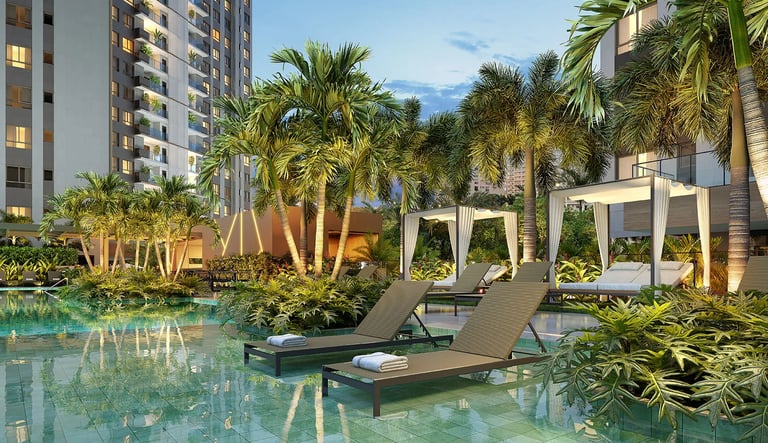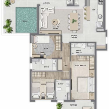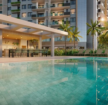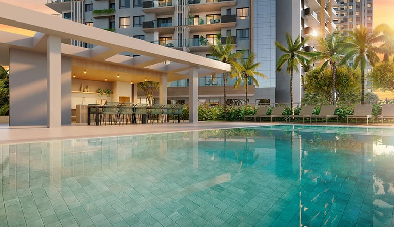 • Piscinas privativas nas unidades garden houses e coberturas.