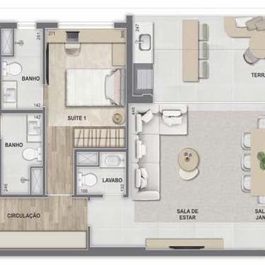 • Opções de Garden Houses, apartamentos com terraço, coberturas duplex e
